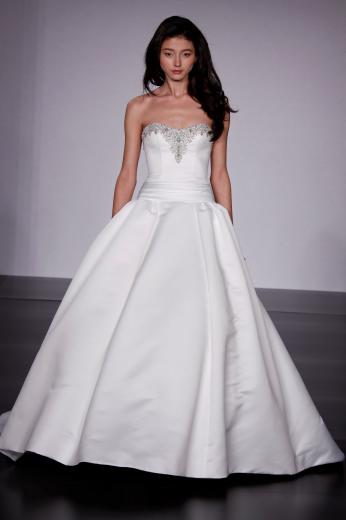 "Tawny" by Augusta Jones is an ivory silk satin gown in a modified A-line silhouette. The deep V-neck bodice is ruched for a flattering fit while the slim A-line skirt is handsomely draped to add a touch of elegance. Thin straps accent the back bodice while a uniquely designed pleated wrap skirt, embellished with a stunning brooch, flows into a chapel length train (please click the link under the photo to view the back).
